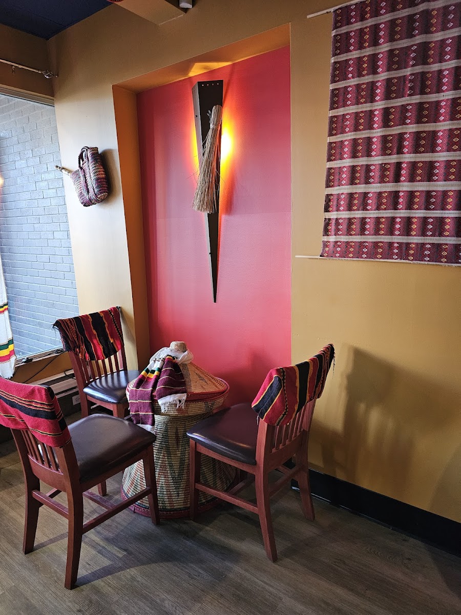 Small dining area. Comfortable. Very friendly staff. Service was excellent. I've never had Ethiopian food before so I didn't really know what to expect nor did I know what to order. Leffe beer on the menu was a nice touch. I got a stew made with beef. I don't remember the name. My wife got pasta with meatballs. Who knew Ethiopians are so good at making Italian food. My daughter got a sample vegetarian plater. Everything was the perfect eating temperature. All in all we had a very favorable dining experience. Oh ya, baklava for dessert.